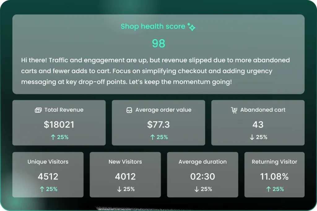 Receive automated weekly summaries that explain your shop health score, abandoned carts, user engagement levels, traffic patterns, and performance trends