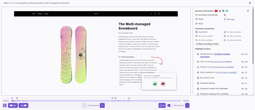 Click Play on any survey response to instantly watch the exact session behind that piece of feedback