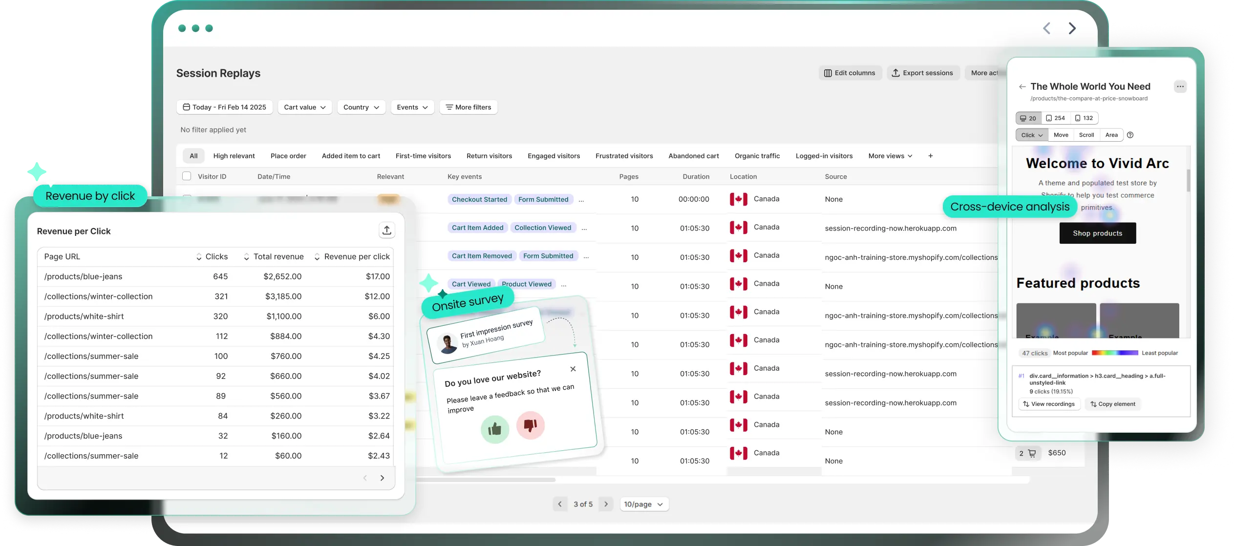 Understand real customer behavior with session recording, revenue clicks, and bounce analytics built for Shopify.