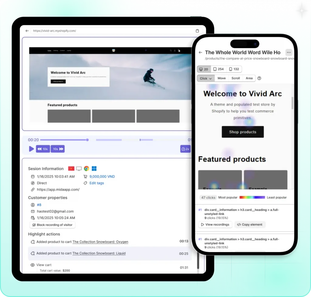 Mida shows true journeys, heatmaps, and funnel friction so you can fix what blocks revenue.