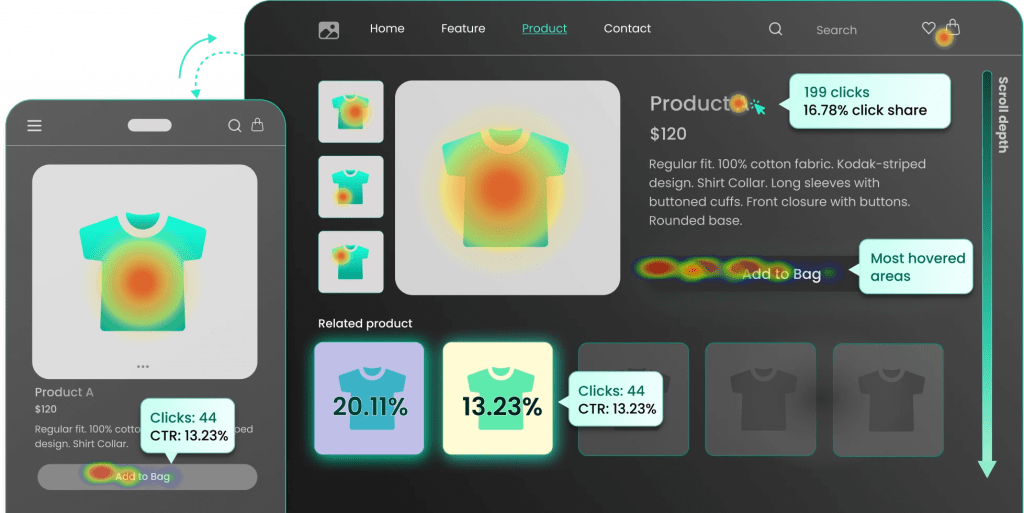 Click heatmaps visualize every tap and click on your store, with warmer colors marking high-activity zones and cooler colors showing ignored areas. They’re particularly useful for testing CTA placement, identifying broken links that customers try to click, and discovering distracting elements that steal attention from conversion-critical buttons.