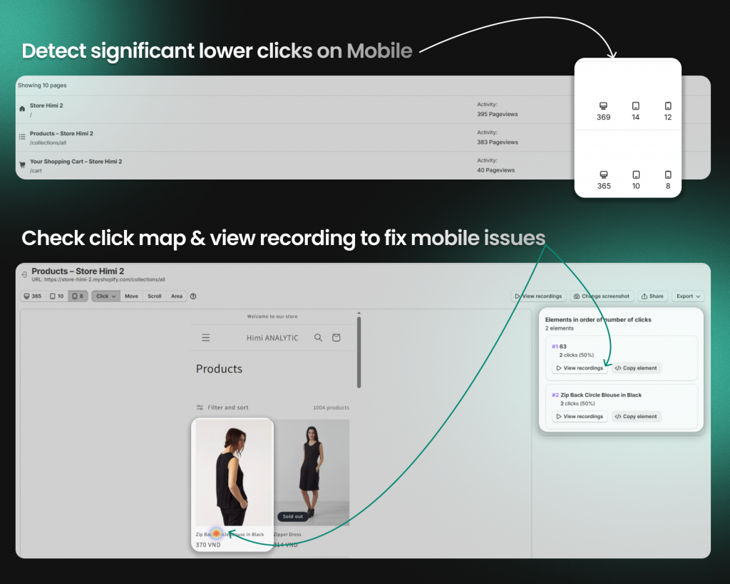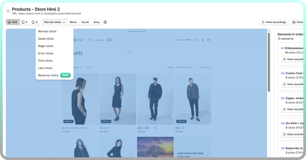 On product pages, check if clicks cluster around the “Add to Cart” button or get scattered across variant selectors, size guides, and images. If shoppers click everything except the buy button, the page layout likely requires attention.