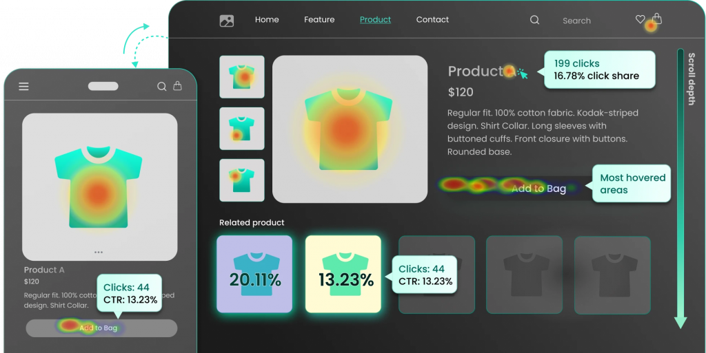 Visitors often hover over images, icons, or text they expect to be interactive. When you see sustained cursor activity on a static element, it signals an opportunity. If visitors repeatedly hover over a product specification that isn’t linked to more detail, adding that functionality gives them what they’re looking for.