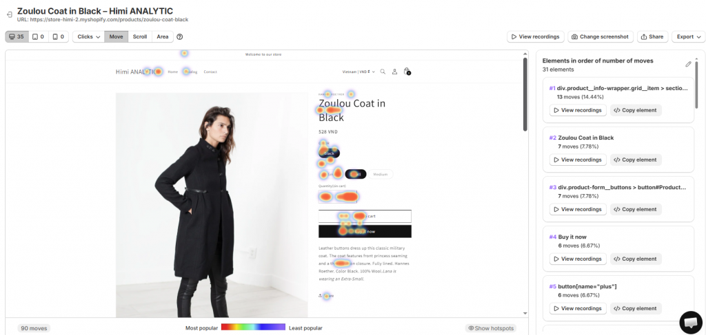 For Shopify merchants, mouse heatmaps become especially powerful when connected to commerce outcomes. You can see whether visitors who hover on product images convert differently than those who don’t, or whether cursor activity on your sizing chart correlates with returns.