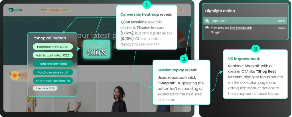 This kind of insight shifts your perspective. The problem is no longer about traffic, but about user experience. With that clarity, you can take targeted actions such as improving CTA clarity, highlighting relevant products, or reducing friction in key steps of the journey.