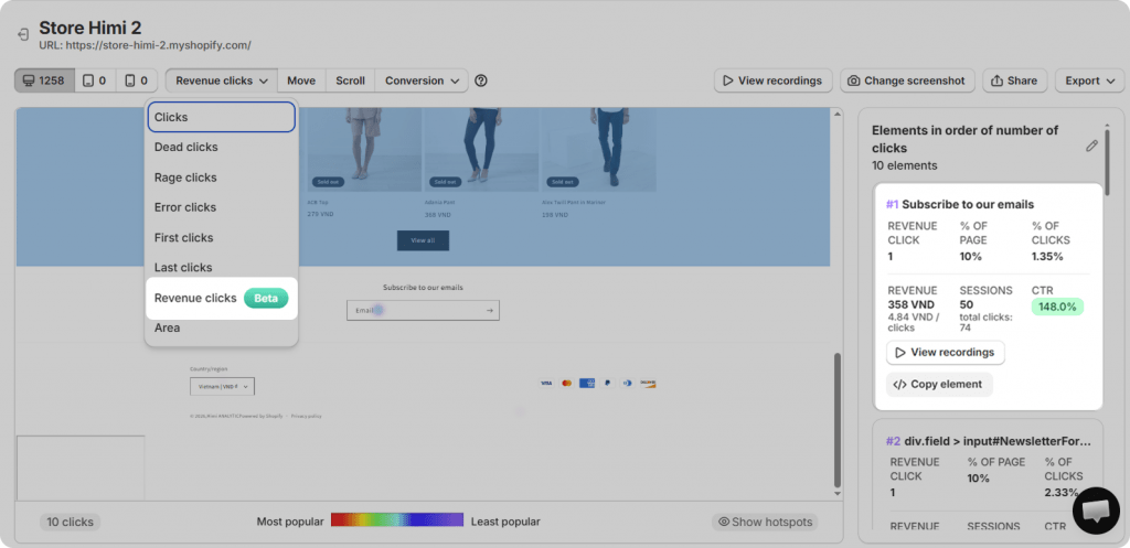 Revenue Click Heatmaps become even more powerful when combined with session replay. For example, an element may receive frequent clicks but generate low revenue. By reviewing session recordings, you might notice hesitation, repeated clicks, or confusion — clear signals of friction.
